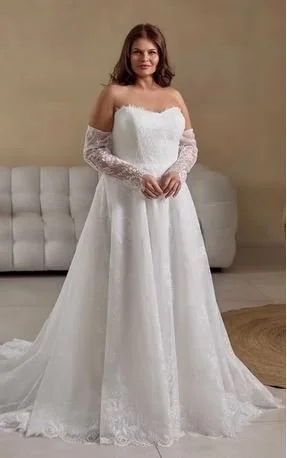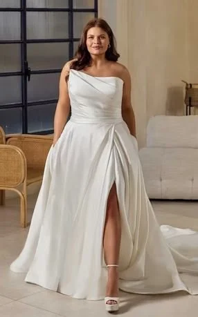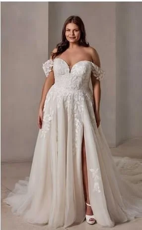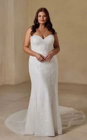 Our collection features a variety of stunning styles, from elegant A-line gowns to dramatic ball gowns and sleek fit and flare silhouettes. With sizes ranging from 16-26, each dress is designed to enhance your natural beauty while offering the perfect fit to ensure you feel confident as you walk down the aisle.